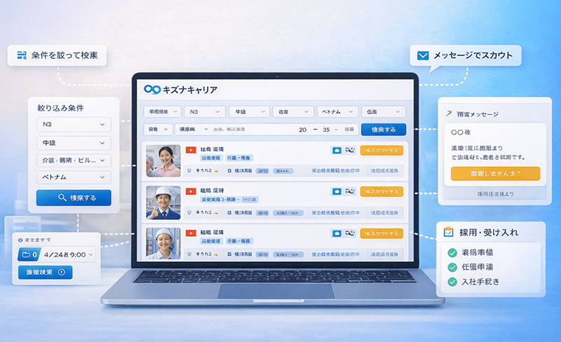 キズナキャリアに登録されている即戦力海外人材へ、システム上から直接スカウトできます。候補者の日本語力・技能レベルを確認しながら、要件に合う人材へ最短でアプローチ。面談設定から受け入れ準備まで、採用の手間とリードタイムをまとめて圧縮します。